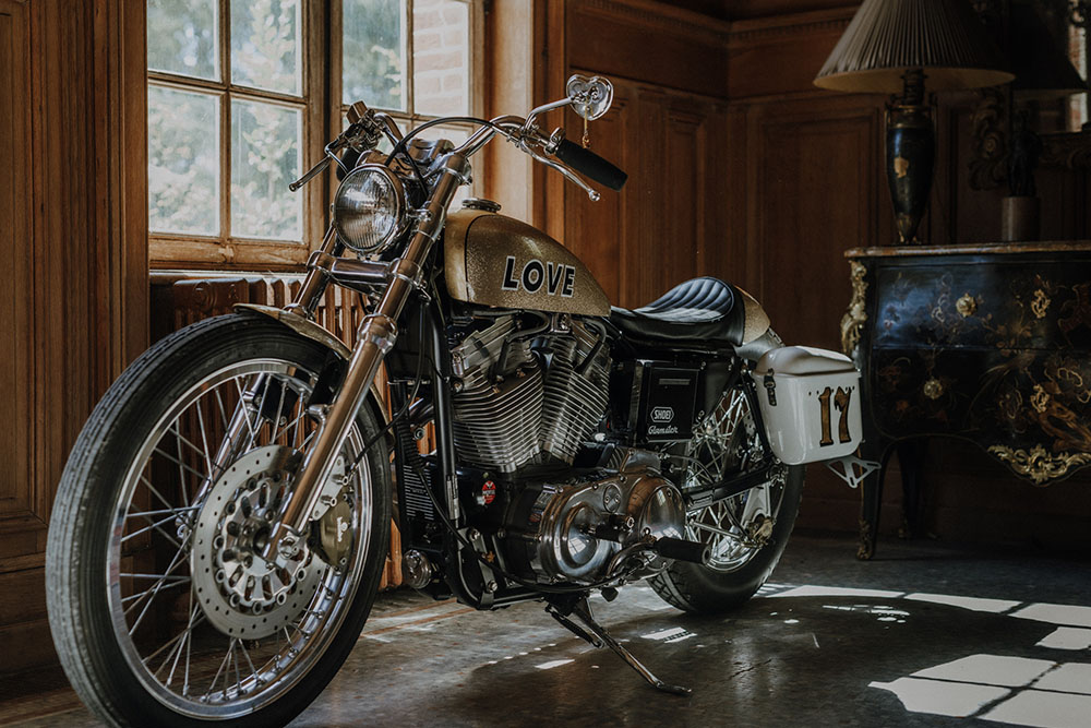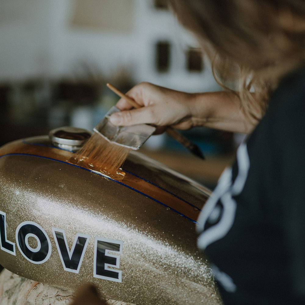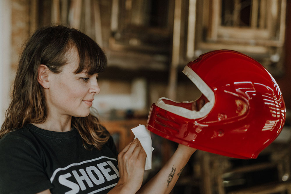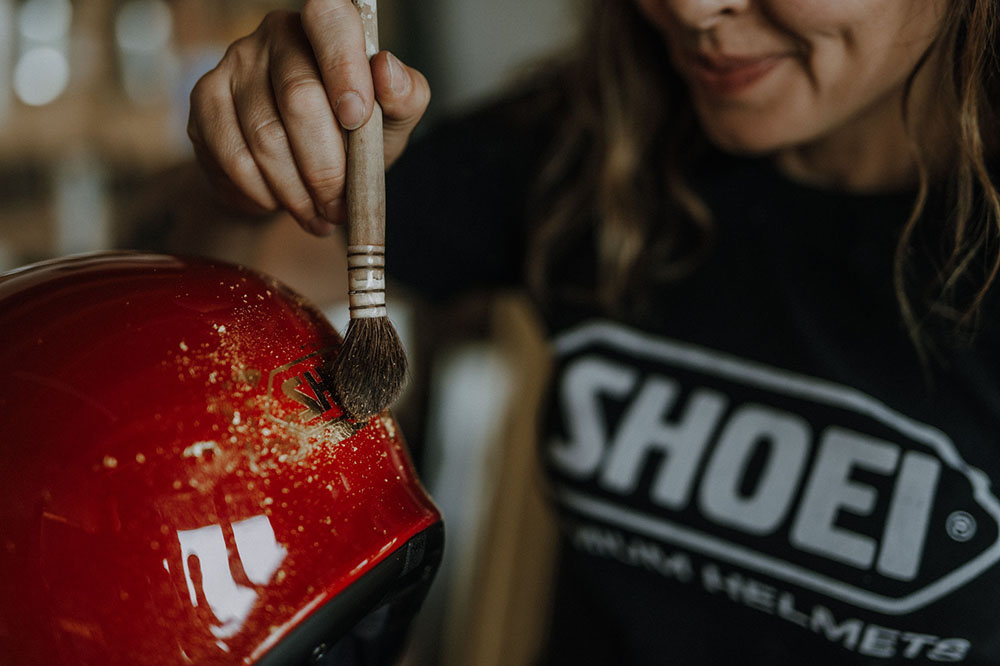 当 Laurence 正在为 Glamster 头盔镀金时,SHOEI 标志等一些最后的细节正在完成“Glamster”自行车组装。